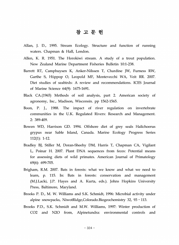 참 고 문 헌 Allan, J. D., 1995. Stream Ecology. Structure and function of running waters. Chapman & Hall, London. Allen, K. R. 1951. The Horokiwi stream. A study of a trout population. New Zealand Marine Department Fisheries Bulletin 101-238. Barrett RT, Camphuysen K, Anker-Nilssen T, Chardine JW, Furness RW, Garthe S, H?ppop O, Leopold MF, Montevecchi WA, Veit RR. 2007. Diet studies of seabirdsA revi...