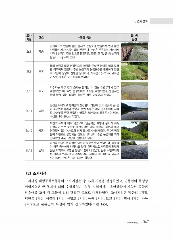 Ⅱ. 조사결과 www.nie.re.kr ? 347 조사 지점 코스 수환경 특성 조사지 전경 St.8 동송 인위적으로 만들어 놓은 습지로 관찰로가 만들어져 있어 많은 사람들이 지나다니는 걸로 판단된다. 수심은 무릎에서 가슴까지 나타나 상당히 깊은 것으로 판단되념, 연꽃, 갈 때, 줄 등 습지식 물들이 조성되어 있다. St.9 토교 물의 흐림이 없고 인위적으로 하상을 준설한 형태로 뻘과 모래 로 이루어져 있었다. 주변 농경지의 농업용수로 활용하여 인위 적 교란이 상당히 진행된 상태이다. 하폭은 1520m, 유폭은 25m, 수심은 2040cm 이었다. St.10 토교 저수지는 매우 깊어 조사는 들어갈 수 있는 수변부에서 일부 수행하였으며, 주변 농경지에서 조사를 수행하였다. 농경지는 물이 얕게 있는 상태로 하상은...