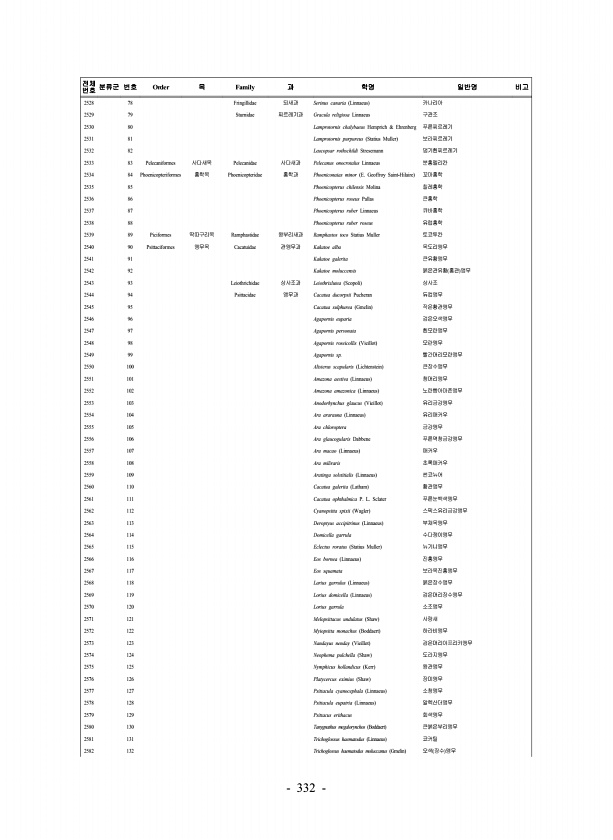 332 전체 번호 분류군 번호 Order 목 Family 과 학명 일반명 비고 2528 78 Fringillidae 되새과 Serinus canaria Linnaeus 카나리아 2529 79 Sturnidae 찌르레기과 Gracula religiosa Linnaeus 구관조 2530 80 Lamprotornis chalybaeus Hemprich & Ehrenberg 푸른찌르레기 2531 81 Lamprotornis purpureus Statius Muller 보라찌르레기 2532 82 Leucopsar rothschildi Stresemann 댕기흰찌르레기 2533 83 Pelecaniformes 사다새목 Pelecanidae 사다새과 Pelecanus onocrotalus Linnaeus 분홍펠리칸 25...
