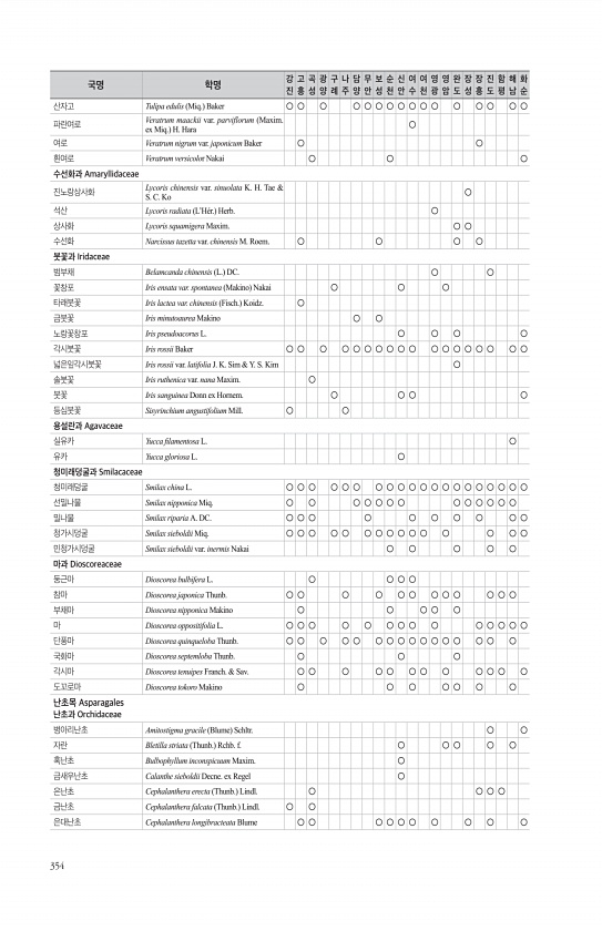 354 산자고 Tulipa edulis Miq. Baker ○ ○ ○ ○ ○ ○ ○ ○ ○ ○ ○ ○ ○ ○ ○ ○ 파란여로 Veratrum maackii var. parviflorum Maxim. ex Miq. H. Hara ○ 여로 Veratrum nigrum var. japonicum Baker ○ ○ 흰여로 Veratrum versicolor Nakai ○ ○ ○ 수선화과 Amaryllidaceae 진노랑상사화 Lycoris chinensis var. sinuolata K. H. Tae & S. C. Ko ○ 석산 Lycoris radiata L’H?r. Herb. ○ 상사화 Lycoris squamigera Maxim. ○ ○ 수선화 Narcissus tazetta var. chinensis M. ...