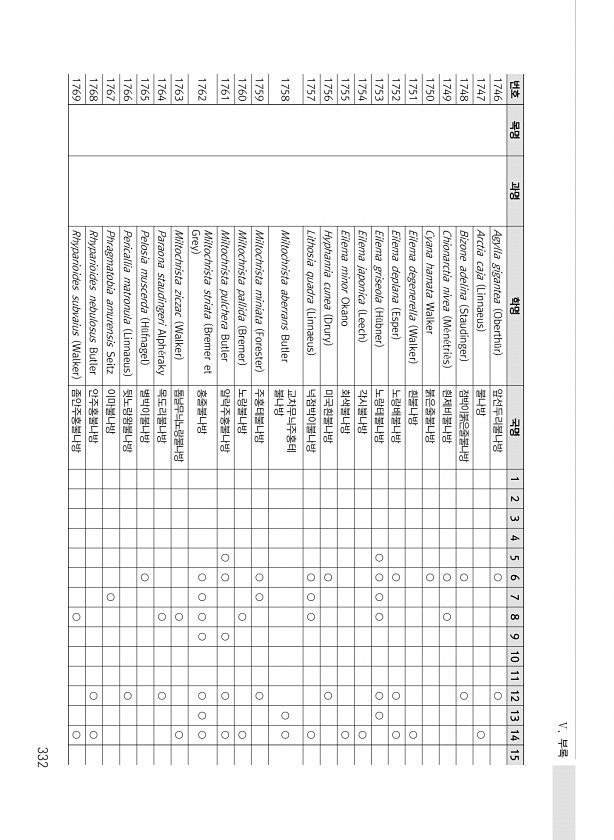 Ⅴ. 부록 332 번호 목명 과명 학명 국명 1 2 3 4 5 6 7 8 9 10 11 12 13 14 15 1746 Agylla gigantea Oberth?r 앞선두리불나방 ○ ○ 1747 Arctia caja Linnaeus 불나방 ○ 1748 Bizone adelina Staudinger 점박이붉은줄불나방 ○ ○ 1749 Chionarctia nivea M?n?tri?s 흰제비불나방 ○ ○ 1750 Cyana hamata Walker 붉은줄불나방 ○ 1751 Eilema degenerella Walker 흰불나방 ○ 1752 Eilema deplana Esper 노랑배불나방 ○ ○ ○ 1753 Eilema griseola H?bner 노랑테불나방 ○ ○ ○ ○ ○ ○ 1754 Eilema japoni...