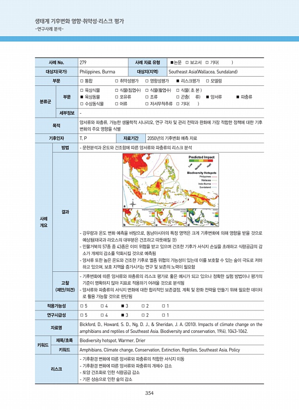 354 생태계 기후변화 영향·취약성·리스크 평가 -연구사례 분석- 사례 No. 279 사례 자료 유형 ■논문 □ 보고서 □ 기타 대상지 국가 Philippines, Burma 대상지 지역 Southeast Asia Wallacea, Sundaland 부문 □ 통합 □ 취약성평가 □ 영향성평가 ■ 리스크평가 □ 모델링 분류군 부문 □ 육상식물 □ 식물 침엽수 □ 식물 활엽수 □ 식물 초 본 ■ 육상동물 □ 포유류 □ 조류 □ 곤충 류 ■ 양서류 ■ 파충류 □ 수상동식물 □ 어류 □ 저서무척추류 □ 기타 세부정보 목적 양서류와 파충류, 가능한 생물학적 시나리오, 연구 격차 및 관리 전략과 완화에 가장 적합한 정책에 대한 기후 변화의 주요 영향을 식별 기후인자 T, P 자료기간 2050년의 기후변화 예측 자료 사...