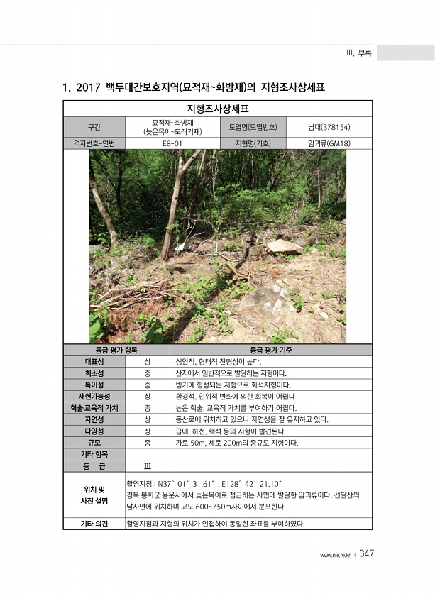 Ⅲ. 부록 www.nie.re.kr ? 347 1. 2017 백두대간보호지역 묘적재화방재 의 지형조사상세표 지형조사상세표 구간 묘적재화방재 늦은목이도래기재 도엽명 도엽번호 남대 378154 격자번호-연번 E8-01 지형명 기호 암괴류 GM18 등급 평가 항목 등급 평가 기준 대표성 상 성인적, 형태적 전형성이 높다. 희소성 중 산지에서 일반적으로 발달하는 지형이다. 특이성 중 빙기에 형성되는 지형으로 화석지형이다. 재현가능성 상 환경적, 인위적 변화에 의한 회복이 어렵다. 학술?교육적 가치 중 높은 학술, 교육적 가치를 부여하기 어렵다. 자연성 상 등산로에 위치하고 있으나 자연성을 잘 유지하고 있다. 다양성 상 급애, 하천, 핵석 등의 지형이 발견된다. 규모 중 가로 50m, 세로 200m의 중규모 지형이다...