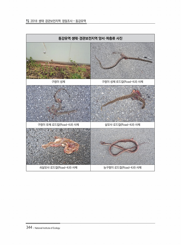 2018 생태·경관보전지역 정밀조사 동강유역 344 ? National Institute of Ecology 동강유역 생태·경관보전지역 양서·파충류 사진 구렁이 성체 구렁이 성체 로드킬 Road-Kill 사체 구렁이 유체 로드킬 Road-Kill 사체 살모사 로드킬 Road-Kill 사체 쇠살모사 로드킬 Road-Kill 사체 능구렁이 로드킬 Road-Kill사체