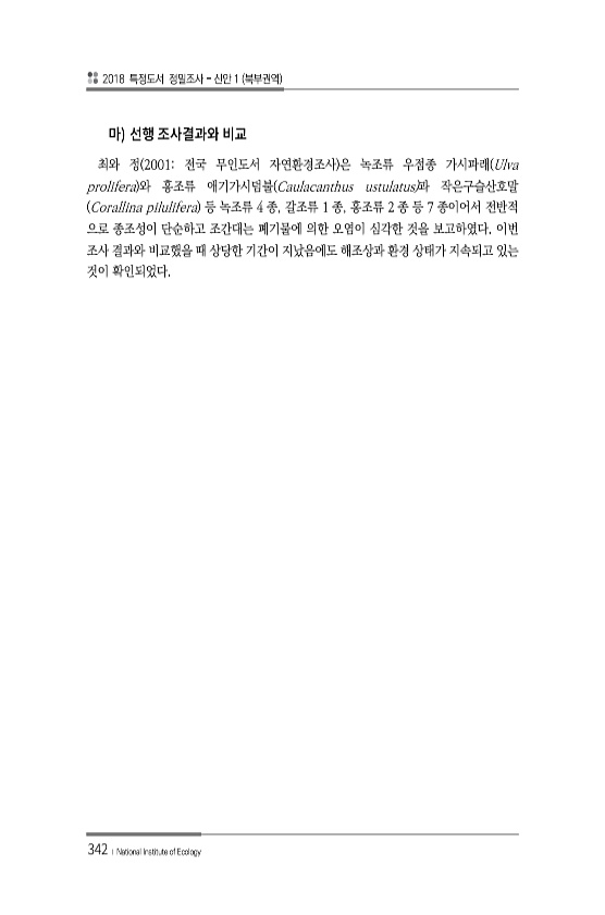 2018 특정도서 정밀조사 신안 1 북부권역 342 ? National Institute of Ecology 최와 정 2001전국 무인도서 자연환경조사 은 녹조류 우점종 가시파래 Ulva prolifera 와 홍조류 애기가시덤불 Caulacanthus ustulatus 과 작은구슬산호말 Corallina pilulifera 등 녹조류 4 종, 갈조류 1 종, 홍조류 2 종 등 7 종이어서 전반적 으로 종조성이 단순하고 조간대는 폐기물에 의한 오염이 심각한 것을 보고하였다. 이번 조사 결과와 비교했을 때 상당한 기간이 지났음에도 해조상과 환경 상태가 지속되고 있는 것이확인되었다.
