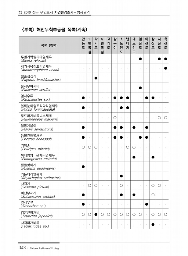 2016 전국 무인도서 자연환경조사 영광권역 348 ? National Institute of Ecology 부록 해안무척추동물 목록 계속 국명 학명 만 풍 도 1 번 목 섬 각 거 도 4 번 목 섬 고 개 도 갈 구 여 소 노 인 도 납 대 기 대 노 인 도 일 산 도 이 산 도 삼 산 도 사 산 도 육 산 도 두발가락멜리타옆새우 Melita rylovae ● ● ● 세가시육질꼬리옆새우 Monocorophium uenoi ● 털손참집게 Pagurus brachiomastus ● 줄새우아재비 Palaemon serrifer ● 옆새우류 Parapleustes sp. ● ● ● ● ● ● 볼록눈이...