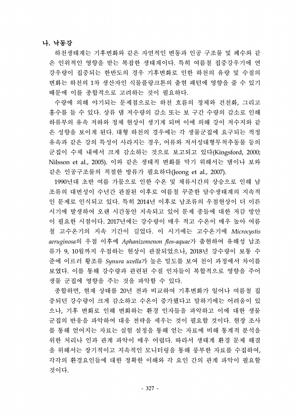 327 나. 낙동강 하천생태계는 기후변화와 같은 자연적인 변동과 인공 구조물 및 폐수와 같 은 인위적인 영향을 받는 복잡한 생태계이다. 특히 여름철 집중강우기에 연 강우량이 집중되는 한반도의 경우 기후변화로 인한 하천의 유량 및 수질의 변화는 하천의 1차 생산자인 식물플랑크톤의 출현 패턴에 영향을 줄 수 있기 때문에 이를 종합적으로 고려하는 것이 필요하다. 수량에 의해 야기되는 문제점으로는 하천 흐름의 정체와 건천화, 그리고 홍수를 들 수 있다. 상류 댐 저수량의 감소 또는 보 구간 수량의 감소로 인해 하류부의 유속 저하와 정체 현상이 생기게 되며 이에 의해 강이 저수지와 같 은 성향을 보이게 된다. 대형 하천의 경우에는 각 생물군집에 요구되는 적정 유속과 같은 강의 특성이 사라지는 경우, 어류와 저서성대형...