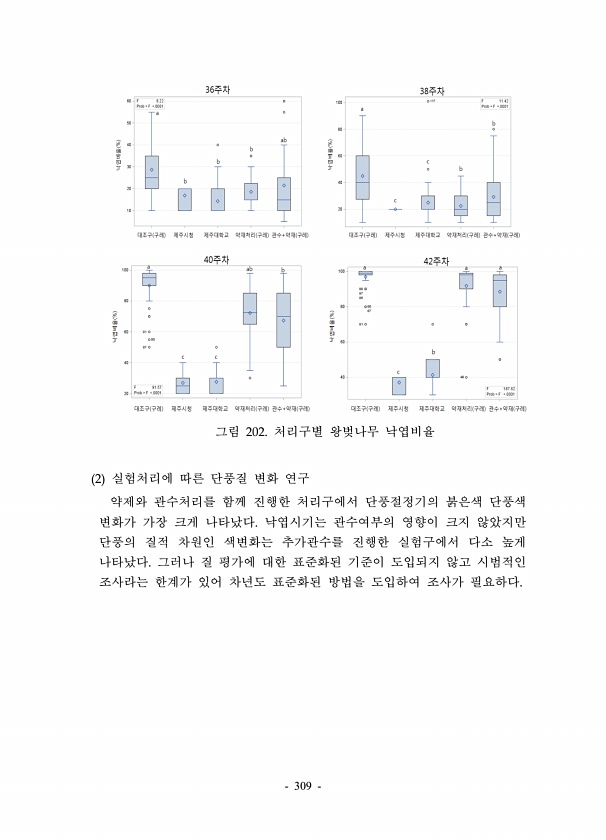 309 그림 202. 처리구별 왕벚나무 낙엽비율 2 실험처리에 따른 단풍질 변화 연구 약제와 관수처리를 함께 진행한 처리구에서 단풍절정기의 붉은색 단풍색 변화가 가장 크게 나타났다. 낙엽시기는 관수여부의 영향이 크지 않았지만 단풍의 질적 차원인 색변화는 추가관수를 진행한 실험구에서 다소 높게 나타났다. 그러나 질 평가에 대한 표준화된 기준이 도입되지 않고 시범적인 조사라는 한계가 있어 차년도 표준화된 방법을 도입하여 조사가필요하다.