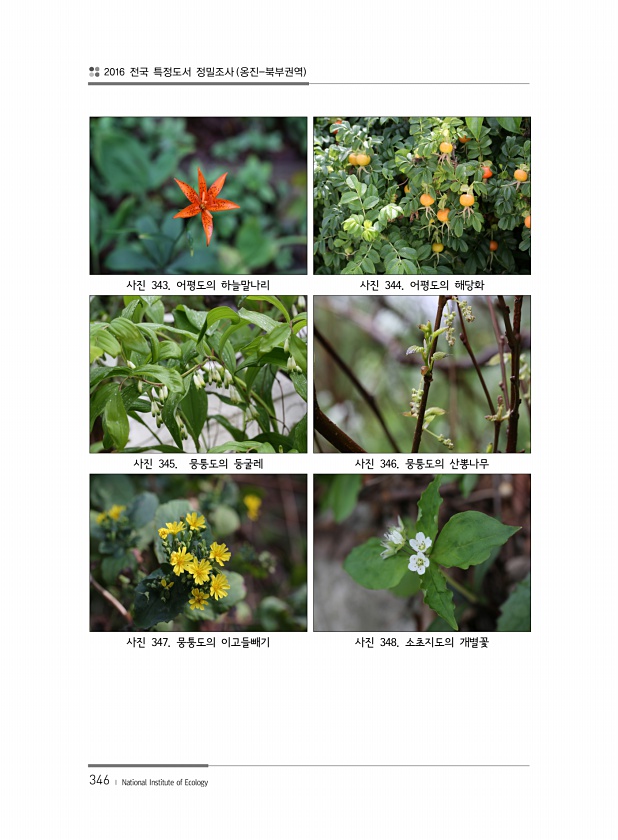 2016 전국 특정도서 정밀조사 옹진-북부권역 346 ? National Institute of Ecology 사진 343. 어평도의 하늘말나리 사진 344. 어평도의 해당화 사진 345. 뭉퉁도의 둥굴레 사진 346. 뭉퉁도의 산뽕나무 사진 347. 뭉퉁도의 이고들빼기 사진 348. 소초지도의개별꽃