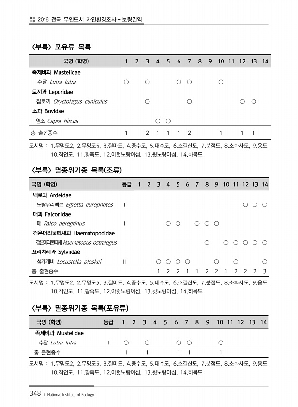 2016 전국 무인도서 자연환경조사 보령권역 348 ? National Institute of Ecology 부록 포유류 목록 국명 학명 1 2 3 4 5 6 7 8 9 10 11 12 13 14 족제비과 Mustelidae 수달 Lutra lutra ○ ○ ○ ○ ○ 토끼과 Leporidae 집토끼 Oryctolagus cuniculus ○ ○ ○ ○ 소과 Bovidae 염소 Capra hircus ○ ○ 총 출현종수 1 2 1 1 1 2 1 1 1 도서명 1.무명도2, 2.무명도5, 3.질마도, 4.중수도, 5.대수도, 6.소길산도, 7.분점도, 8.소화사도, 9.용도, 10.직언도, 11.황죽도, 12.아랫노랑이섬, 13.윗노랑이섬, 14.하목도 부록 멸종위기종 목록 조류 국명 학명 등급 1 2 3 4...