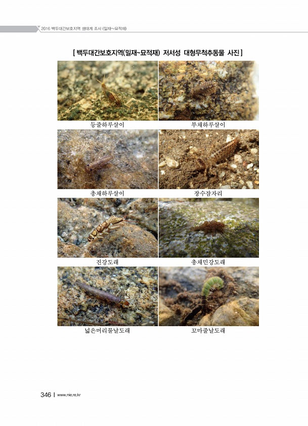2016 백두대간보호지역 생태계 조사 밀재묘적재 346Ⅰwww.nie.re.kr [ 백두대간보호지역 밀재묘적재 저서성 대형무척추동물 사진 ] 등줄하루살이 부채하루살이 총채하루살이 장수잠자리 진강도래 총채민강도래 넓은머리물날도래꼬마줄날도래