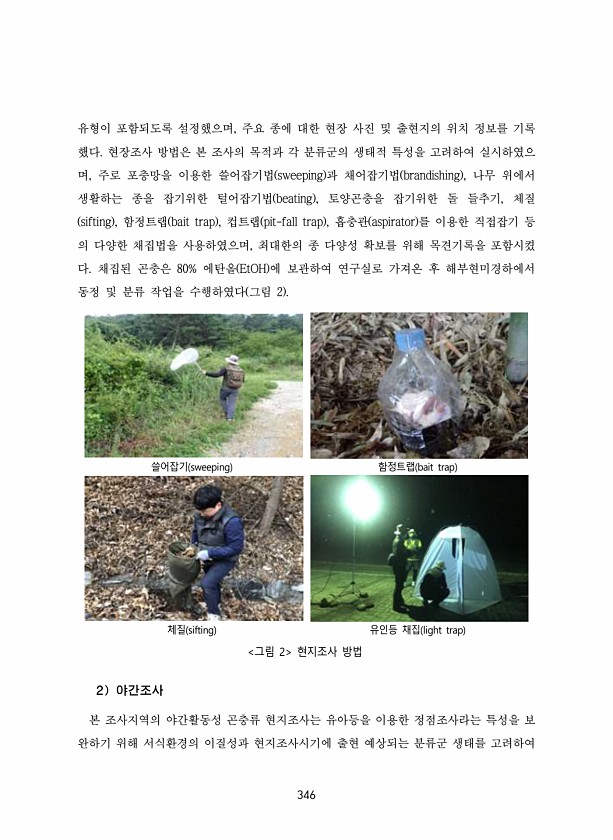 346 유형이 포함되도록 설정했으며, 주요 종에 대한 현장 사진 및 출현지의 위치 정보를 기록 했다. 현장조사 방법은 본 조사의 목적과 각 분류군의 생태적 특성을 고려하여 실시하였으 며, 주로 포충망을 이용한 쓸어잡기법 sweeping 과 채어잡기법 brandishing , 나무 위에서 생활하는 종을 잡기위한 털어잡기법 beating , 토양곤충을 잡기위한 돌 들추기, 체질 sifting , 함정트랩 bait trap , 컵트랩 pit-fall trap , 흡충관 aspirator 를 이용한 직접잡기 등 의 다양한 채집법을 사용하였으며, 최대한의 종 다양성 확보를 위해 목견기록을 포함시켰 다. 채집된 곤충은 80% 에탄올 EtOH 에 보관하여 연구실로 가져온 후 해부현미경하에서 동정 및 분류 작업을 수행하였...