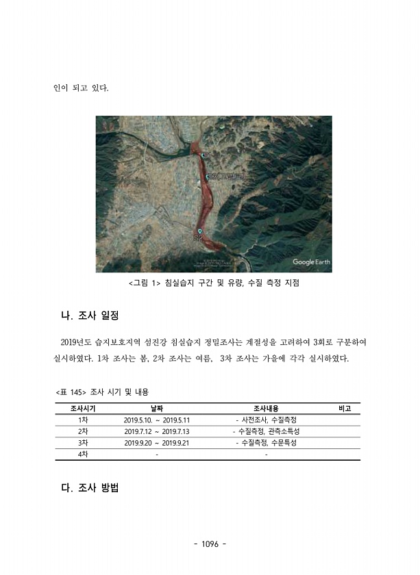1096 인이 되고 있다. 그림 1 침실습지 구간 및 유량, 수질 측정 지점 나. 조사 일정 2019년도 습지보호지역 섬진강 침실습지 정밀조사는 계절성을 고려하여 3회로 구분하여 실시하였다. 1차 조사는 봄, 2차 조사는 여름, 3차 조사는 가을에 각각 실시하였다. 조사시기 날짜 조사내용 비고 1차 2019.5.10. 2019.5.11 사전조사, 수질측정 2차 2019.7.12 2019.7.13 수질측정, 관측소특성 3차 2019.9.20 2019.9.21 수질측정, 수문특성 4차 표 145 조사 시기 및 내용 다. 조사방법