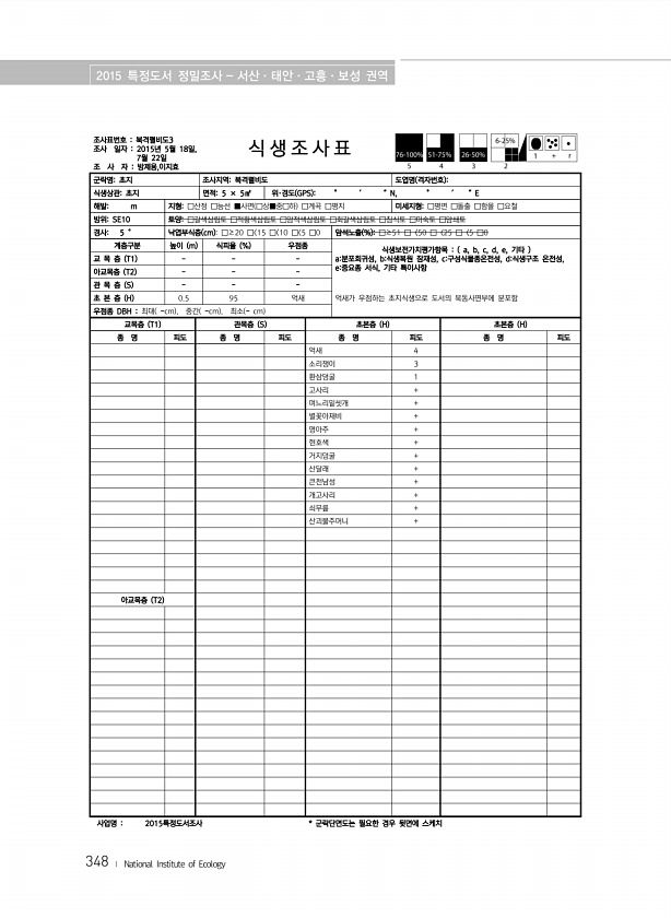 2015 특정도서 정밀조사 서산·태안·고흥·보성 권역 348 ? National Institute of Ecology 조사표번호 북격렬비도3 조사 일자 2015년 5월 18일, 7월 22일 조 사 자 방제용,이지효 식 생 조 사 표 군락명초지 조사지역북격렬비도 도엽명 격자번호 식생상관초지 면적5 × 5㎡ 위·경도 GPS ° ′ ″N, ° ′ ″E 해발m 지형□산정 □능선 ■사면 □상■중□하 □계곡 □평지 미세지형□평면 □돌출 □함몰 □요철 방위SE10 토양□갈색삼림토 □적황색삼림토 □암적색삼림토 □회갈색삼림토 □침식토 □미숙토 □암쇄토 경사5 ° 낙엽부식층 cm □≥20 □ 15 □ 10 □ 5 □0 암석노출 % □≥51 □〈50 □〈25 □〈5 □0 계층구분 높이 m 식피율 % 우점종 식생보전가치평가항목 ...
