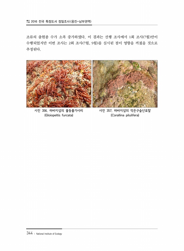 2016 전국 특정도서 정밀조사 옹진-남부권역 344 ? National Institute of Ecology 조류의 출현종 수가 소폭 증가하였다. 이 결과는 선행 조사에서 1회 조사 7월 만이 수행되었지만 이번 조사는 2회 조사 7월, 9월 를 실시된 점이 영향을 끼쳤을 것으로 추정된다. 사진 356. 하바지섬의 불등풀가사리 Gloiopeltis furcata 사진 357. 하바지섬의 작은구슬산호말 Corallina pilulifera