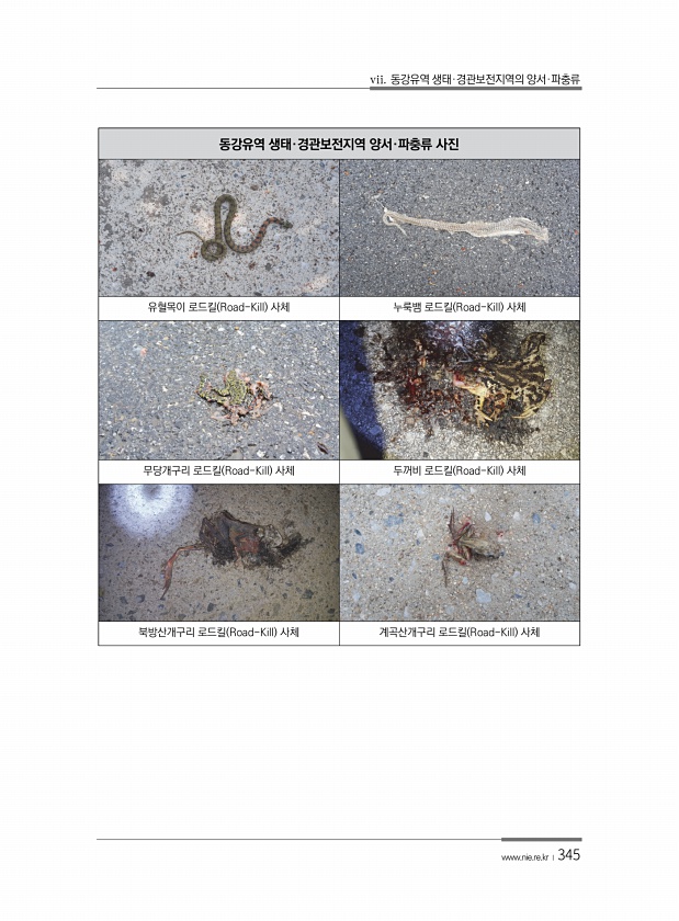 vii. 동강유역 생태·경관보전지역의 양서·파충류 www.nie.re.kr ?345 동강유역 생태·경관보전지역 양서·파충류 사진 유혈목이 로드킬 Road-Kill 사체 누룩뱀 로드킬 Road-Kill 사체 무당개구리 로드킬 Road-Kill 사체 두꺼비 로드킬 Road-Kill 사체 북방산개구리 로드킬 Road-Kill 사체 계곡산개구리 로드킬 Road-Kill사체