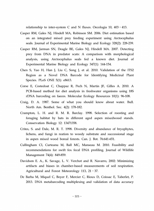 relationship to inter-system C and N fluxes. Oecologia 10, 403?413. Casper RM, Gales NJ, Hindell MA, Robinson SM. 2006. Diet estimation based on an integrated mixed prey feeding experiment using Arctocephalus seals. Journal of Experimental Marine Biology and Ecology 328 2 228-239. Casper RM, Jarman SN, Deagle BE, Gales NJ, Hindell MA. 2007. Detecting prey from DNA in predator scatsA comparison wit...