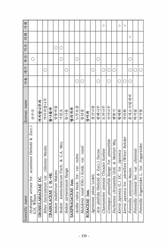 Scientific name Korean name 서울 대구 부산 익산 외래 식재 Hydrangea serrata for. acuminata Siebold & Zucc. E.H. Wilson 산수국 ○ GROSSULARIACEAE DC. 까치밥나무과 Ribes fasciculatum var. chinense Maxim. 까마귀밥나무 ○ CRASSULACEAE J. St.-Hil. 돌나물과 Sedum bulbiferum Makino 말똥비름 ○ Sedum kamtschaticum Fisch. & C.A. Mey. 기린초 ○ ○ Sedum sarmentosum Bunge 돌나물 ○ SAXIFRAGACEAE Juss. 범의귀과 Astilbe rubra Hook. ...