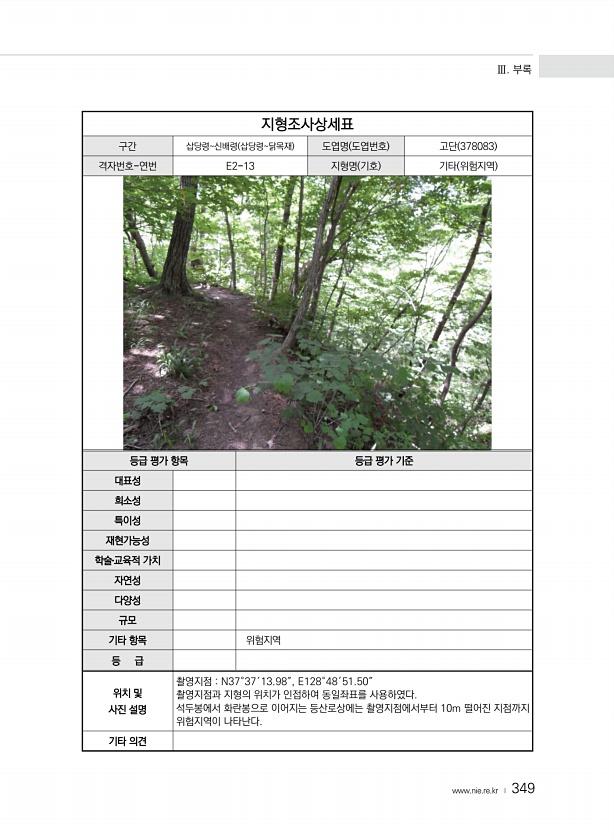 Ⅲ. 부록 www.nie.re.kr ? 349 지형조사상세표 구간 삽당령신배령 삽당령닭목재 도엽명 도엽번호 고단 378083 격자번호-연번 E2-13 지형명 기호 기타 위험지역 등급 평가 항목 등급 평가 기준 대표성 희소성 특이성 재현가능성 학술?교육적 가치 자연성 다양성 규모 기타 항목 위험지역 등 급 위치 및 사진 설명 촬영지점 N37°37′13.98″, E128°48′51.50″ 촬영지점과 지형의 위치가 인접하여 동일좌표를 사용하였다. 석두봉에서 화란봉으로 이어지는 등산로상에는 촬영지점에서부터 10m 떨어진 지점까지 위험지역이 나타난다. 기타의견