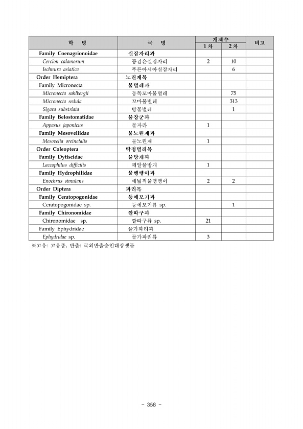 Ⅱ. 조사결과 www.nie.re.kr ? 349 다 3구간 명파리, 부봉천 코스 본 현지조사 결과 총 4목 8과 14종 590개체가 조사되었고 우점종은 참갈겨니, 아우점종은 버들개였고 기타 우세종은 잔가시고기, 점몰개, 밀어, 북방종개 등이었다. 한국고유종은 점몰개, 참갈겨니, 북방종개, 미유기, 퉁가리 등 5종이 조사되었다. 법적보호종으로 멸종위기야생생물 II급인 한둑중개 1종이 확인되었고 천연기념물이나 생태계교란야생생물은 채집되지 않았다 표 128 어종명 조사지점 계 RA 4 5 6 7 8 % 비고 Cyprinidae, 잉어과 Rhynchocypris steindachneri, 버들개 89 24 8 15 136 23.05 순 Squalidus multimaculatus, 점몰개 14 37 51 8.64...