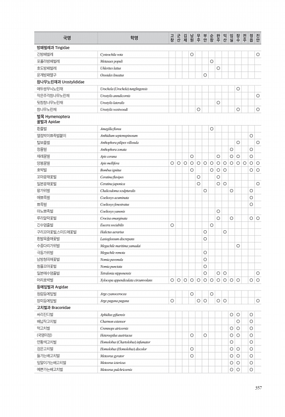 357 방패벌레과 Tingidae 긴방패벌레 Cysteochila vota ○ ○ 포풀라방패벌레 Metasaes populi ○ 호도방패벌레 Uhlerites latius ○ 운계방패멸구 Ossoides lineatus ○ 참나무노린재과 Urostylididae 애두쌍무늬노린재 Urochela Urochela tunglingensis ○ 작은주걱참나무노린재 Urostylis annulicornis ○ 뒷창참나무노린재 Urostylis lateralis ○ 참나무노린재 Urostylis westwoodi ○ ○ ○ 벌목 Hymenoptera 꿀벌과 Apidae 흰줄벌 Amegilla forea ○ 열점박이뾰족벌붙이 Anthidium septemspinosum ○ 털보줄벌 Anthophora pilipes vi...