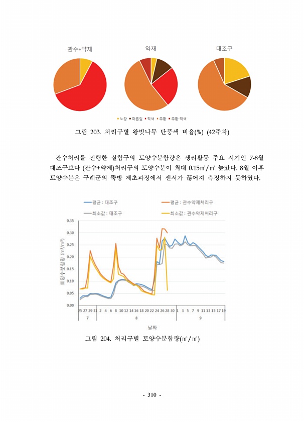 310 그림 203. 처리구별 왕벚나무 단풍색 비율 % 42주차 관수처리를 진행한 실험구의 토양수분함량은 생리활동 주요 시기인 7-8월 대조구보다 관수+약제 처리구의 토양수분이 최대 0.15㎥/㎥ 높았다. 8월 이후 토양수분은 구례군의 뚝방 제초과정에서 센서가 끊어져 측정하지 못하였다. 그림 204. 처리구별 토양수분함량 ㎥/㎥