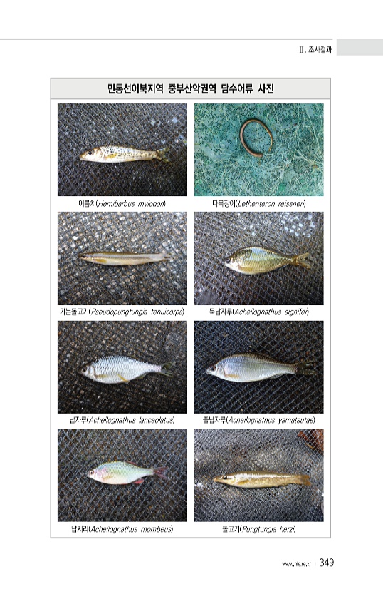 Ⅱ. 조사결과 www.nie.re.kr ? 349 민통선이북지역 중부산악권역 담수어류 사진 어름치 Hemibarbus mylodon 다묵장어 Lethenteron reissneri 가는돌고기 Pseudopungtungia tenuicorpa 묵납자루 Acheilognathus signifer 납자루 Acheilognathus lanceolatus 줄납자루 Acheilognathus yamatsutae 납지리 Acheilognathus rhombeus 돌고기 Pungtungia herzi
