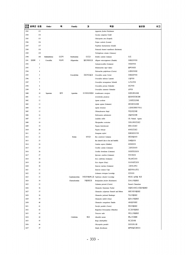 333 전체 번호 분류군 번호 Order 목 Family 과 학명 일반명 비고 2583 133 Agapornis fischeri Reichenow 2584 134 Cacatua sanguinea Gould 2585 135 Chalcopsitta atra Scopoli 2586 136 Forpus coelestis Lesson 2587 137 Psephotus haematonotus Gould 2588 138 Psittacula krameri manillensis Bechstein 2589 139 Trichoglossus ornatus Linnaeus 2590 140 Struthioniformes 타조목 Struthionidae 타조과 Struthio camelus Linnaeus 타조 2591 파충류 1 C...