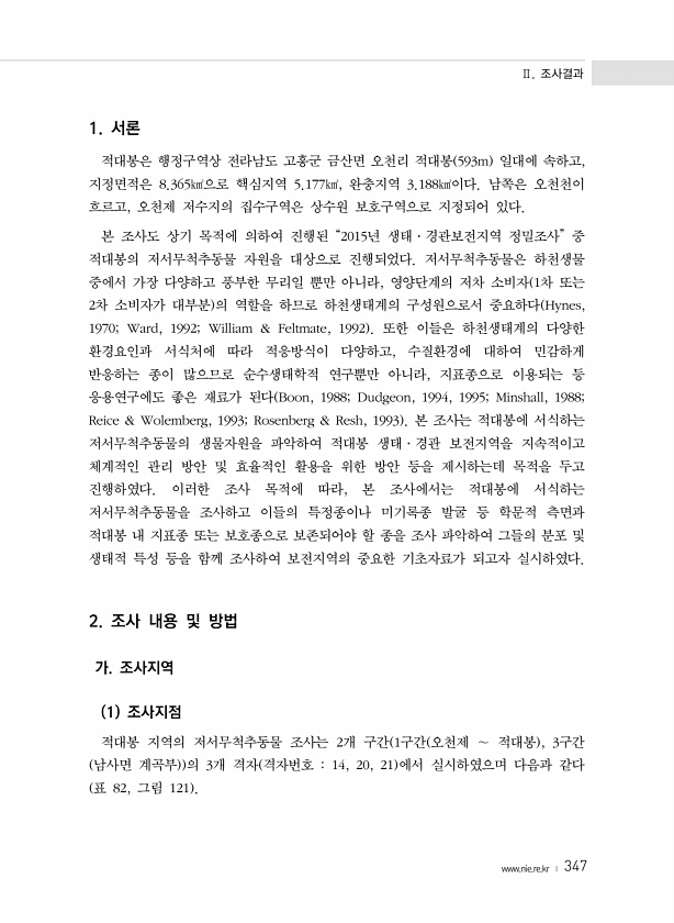 Ⅱ. 조사결과 www.nie.re.kr ? 347 1. 서론 적대봉은 행정구역상 전라남도 고흥군 금산면 오천리 적대봉 593m 일대에 속하고, 지정면적은 8.365㎢으로 핵심지역 5.177㎢, 완충지역 3.188㎢이다. 남쪽은 오천천이 흐르고, 오천제 저수지의 집수구역은 상수원 보호구역으로 지정되어 있다. 본 조사도 상기 목적에 의하여 진행된 “2015년 생태·경관보전지역 정밀조사” 중 적대봉의 저서무척추동물 자원을 대상으로 진행되었다. 저서무척추동물은 하천생물 중에서 가장 다양하고 풍부한 무리일 뿐만 아니라, 영양단계의 저차 소비자 1차 또는 2차 소비자가 대부분 의 역할을 하므로 하천생태계의 구성원으로서 중요하다 Hynes, 1970; Ward, 1992; William & Feltmate, 1992 또...