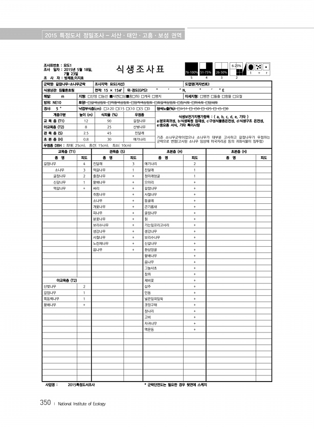 2015 특정도서 정밀조사 서산·태안·고흥·보성 권역 350 ? National Institute of Ecology 조사표번호 묘도1 조사 일자 2015년 5월 18일, 7월 23일 조 사 자 방제용,이지효 식 생 조 사 표 군락명갈참나무-소나무군락 조사지역묘도 서산 도엽명 격자번호 식생상관침활혼효림 면적15 × 15㎡ 위·경도 GPS ° ′ ″N, ° ′ ″E 해발m 지형□산정 □능선 ■사면 □상■중□하 □계곡 □평지 미세지형□평면 □돌출 □함몰 □요철 방위NE10 토양□갈색삼림토 □적황색삼림토 □암적색삼림토 □회갈색삼림토 □침식토 □미숙토 □암쇄토 경사5 ° 낙엽부식층 cm □≥20 □ 15 □ 10 □ 5 □0 암석노출 % □≥51 □〈50 □〈25 □〈5 □0 계층구분 높이 m 식피율 % 우점종 식...