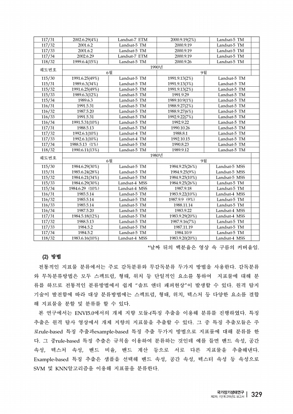 궤도번호 년 월 월 궤도번호 년 월 월 날짜 뒤의 백분율은 영상 속 구름의 커버율임 방법 전통적인 지표물 분류에서는 주로 감독분류와 무감독분류 두가지 방법을 사용한다 감독분류 와 무독분류방법은 모두 스펙트럼 형태 위치 등 단일적인 요소를 통하여 지표물에 대해 분 류를 하므로 전통적인 분류방법에서 쉽게 솔트 앤더 패퍼현상 이 발생할 수 있다 원격 탐지 기술이 발전함에 따라 대상 분류방법에는 스펙트럼 형태 위치 텍스처 등 다양한 요소를 결합 해 지표물을 분할 및 분류를 할 수 있다 본 연구에서는 에서의 개체 지향 모듈 특징 추출을 이용해 분류를 진행하였다 특징 추출은 원격 탐사 영상에서 개체 지향의 지표물을 추출할 수 있다 그 중 특징 추출모듈은 주 로 특징 추출과 특징 추출 두가지 방법으로 지표물에 대해 분류...
