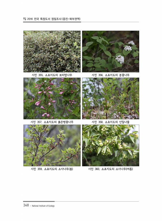 2016 전국 특정도서 정밀조사 옹진-북부권역 348 ? National Institute of Ecology 사진 355. 소초지도의 보리밥나무 사진 356. 소초지도의 분꽃나무 사진 357. 소초지도의 붉은병꽃나무 사진 358. 소초지도의 선밀나물 사진 359. 소초지도의 소사나무 봄 사진 360. 소초지도의 소사나무 여름