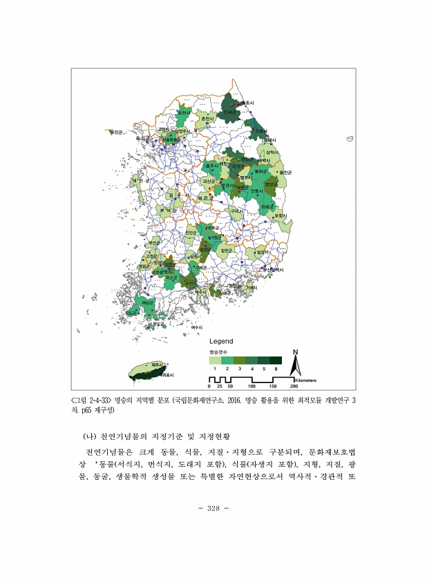328 그림 2-4-33 명승의 지역별 분포 국립문화재연구소. 2016. 명승 활용을 위한 최적모듈 개발연구 3 차. p65 재구성 나 천연기념물의 지정기준 및 지정현황 천연기념물은 크게 동물, 식물, 지질·지형으로 구분되며, 문화재보호법 상 ‘동물 서식지, 번식지, 도래지 포함 , 식물 자생지 포함 , 지형, 지질, 광 물, 동굴, 생물학적 생성물 또는 특별한 자연현상으로서 역사적·경관적또