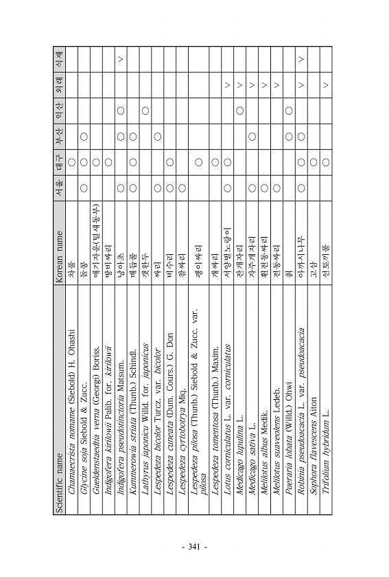 Scientific name Korean name 서울 대구 부산 익산 외래 식재 Chamaecrista nomame Siebold H. Ohashi 차풀 ○ Glycine soja Siebold & Zucc. 돌콩 ○ ○ ○ Gueldenstaedtia verna Georgi Boriss. 애기자운 털새동부 ○ Indigofera kirilowii Palib. for. kirilowii 땅비싸리 ○ Indigofera pseudotinctoria Matsum. 낭아초 ○ ○ ○ ∨ Kummerowia striata Thunb. Schindl. 매듭풀 ○ ○ ○ Lathyrus japonicu Willd. for. japonicus 갯완두 ○ Lesped...