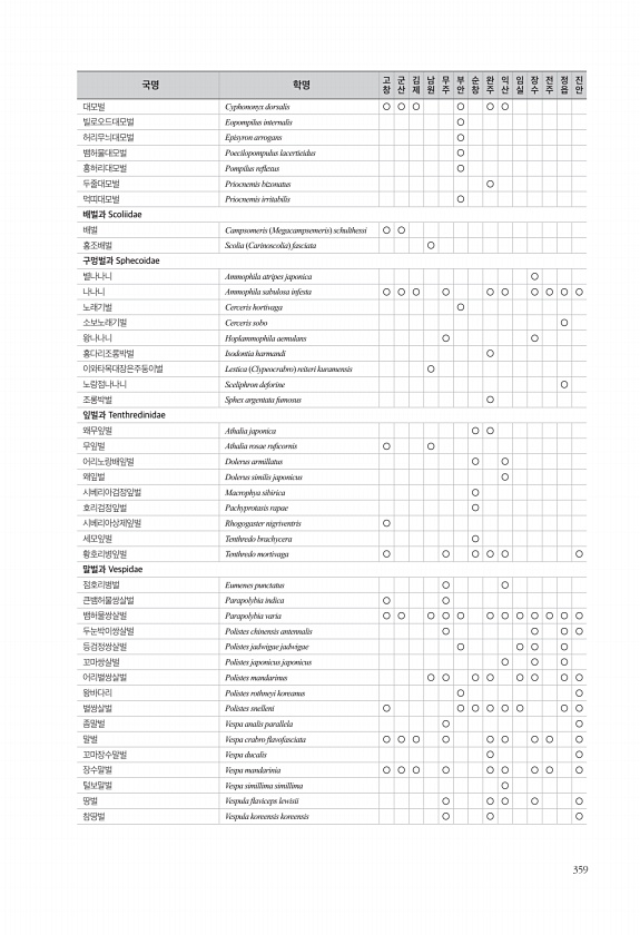 359 대모벌 Cyphononyx dorsalis ○ ○ ○ ○ ○ ○ 빌로오드대모벌 Eopompilus internalis ○ 허리무늬대모벌 Episyron arrogans ○ 뱀허물대모벌 Poecilopompulus lacertieidus ○ 홍허리대모벌 Pompilus refexus ○ 두줄대모벌 Priocnemis bizonatus ○ 먹띠대모벌 Priocnemis irritabilis ○ 배벌과 Scoliidae 배벌 Campsomeris Megacampsemeris schulthessi ○ ○ 홍조배벌 Scolia Carinoscolia fasciata ○ 구멍벌과 Sphecoidae 별나나니 Ammophila atripes japonica ○ 나나니 Ammophila sabulosa infest...