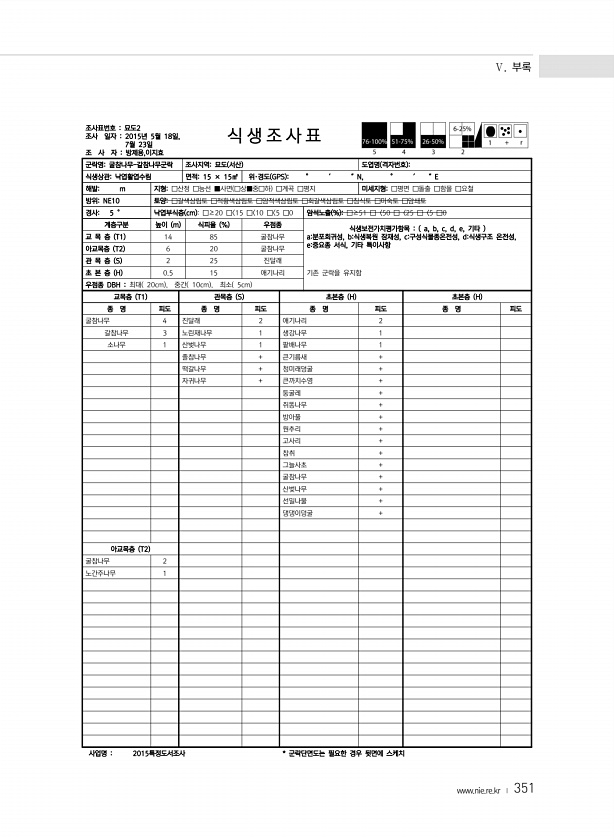 Ⅴ. 부록 www.nie.re.kr ? 351 조사표번호 묘도2 조사 일자 2015년 5월 18일, 7월 23일 조 사 자 방제용,이지효 식 생 조 사 표 군락명굴참나무-갈참나무군락 조사지역묘도 서산 도엽명 격자번호 식생상관낙엽활엽수림 면적15 × 15㎡ 위·경도 GPS ° ′ ″N, ° ′ ″E 해발m 지형□산정 □능선 ■사면 □상■중□하 □계곡 □평지 미세지형□평면 □돌출 □함몰 □요철 방위NE10 토양□갈색삼림토 □적황색삼림토 □암적색삼림토 □회갈색삼림토 □침식토 □미숙토 □암쇄토 경사5 ° 낙엽부식층 cm □≥20 □ 15 □ 10 □ 5 □0 암석노출 % □≥51 □〈50 □〈25 □〈5 □0 계층구분 높이 m 식피율 % 우점종 식생보전가치평가항목 a, b, c, d, e, 기타 a분포희귀성, b식...