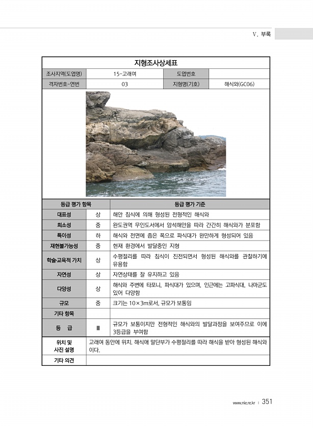 Ⅴ. 부록 www.nie.re.kr ? 351 지형조사상세표 조사지역 도엽명 15-고래여 도엽번호 격자번호-연번 03 지형명 기호 해식와 GC06 등급 평가 항목 등급 평가 기준 대표성 상 해안 침식에 의해 형성된 전형적인 해식와 희소성 중 완도권역 무인도서에서 암석해안을 따라 간간히 해식와가 분포함 특이성 하 해식와 전면에 좁은 폭으로 파식대가 완만하게 형성되어 있음 재현불가능성 중 현재 환경에서 발달중인 지형 학술?교육적 가치 상 수평절리를 따라 침식이 진전되면서 형성된 해식와를 관찰하기에 유용함 자연성 상 자연상태를 잘 유지하고 있음 다양성 상 해식와 주변에 타포니, 파식대가 있으며, 인근에는 고파식대, 나마군도 있어 다양함 규모 중 크기는 10×3m로서, 규모가 보통임 기타 항목 등 급 Ⅲ 규모가 보...