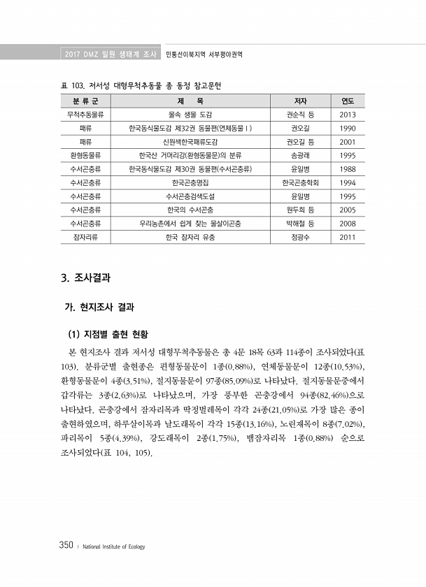 2017 DMZ 일원 생태계 조사 민통선이북지역 서부평야권역 350 ? National Institute of Ecology 표 103. 저서성 대형무척추동물 종 동정 참고문헌 분 류 군 제 목 저자 연도 무척추동물류 물속 생물 도감 권순직 등 2013 패류 한국동식물도감 제32권 동물편 연체동물Ⅰ 권오길 1990 패류 신원색한국패류도감 권오길 등 2001 환형동물류 한국산 거머리강 환형동물문 의 분류 송광래 1995 수서곤충류 한국동식물도감 제30권 동물편 수서곤충류 윤일병 1988 수서곤충류 한국곤충명집 한국곤충학회 1994 수서곤충류 수서곤충검색도설 윤일병 1995 수서곤충류 한국의 수서곤충 원두희 등 2005 수서곤충류 우리농촌에서 쉽게 찾는 물살이곤충 박해철 등 2008 잠자리류 한국 잠자리 유충 ...