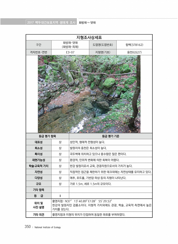 2017 백두대간보호지역 생태계 조사 화방재 댓재 350 ? National Institute of Ecology 지형조사상세표 구간 화방재댓재 화방재피재 도엽명 도엽번호 함백 378162 격자번호-연번 E3-07 지형명 기호 용천 GS27 등급 평가 항목 등급 평가 기준 대표성 상 성인적, 형태적 전형성이 높다. 희소성 상 발원지의 용천은 희소성이 높다. 특이성 상 곡두벽에 위치하고 있으나 용수량은 많은 편이다. 재현가능성 상 환경적, 인위적 변화에 의한 회복이 어렵다. 학술?교육적 가치 상 한강 발원지로서 교육, 관광자원으로서의 가치가 높다. 자연성 상 직접적인 접근을 제한하기 위한 데크외에는 자연상태를 유지하고 있다. 다양성 상 애추, 포트홀, 기반암 하상 등의 지형이 나타난다. 규모 상 가로 1.5m...