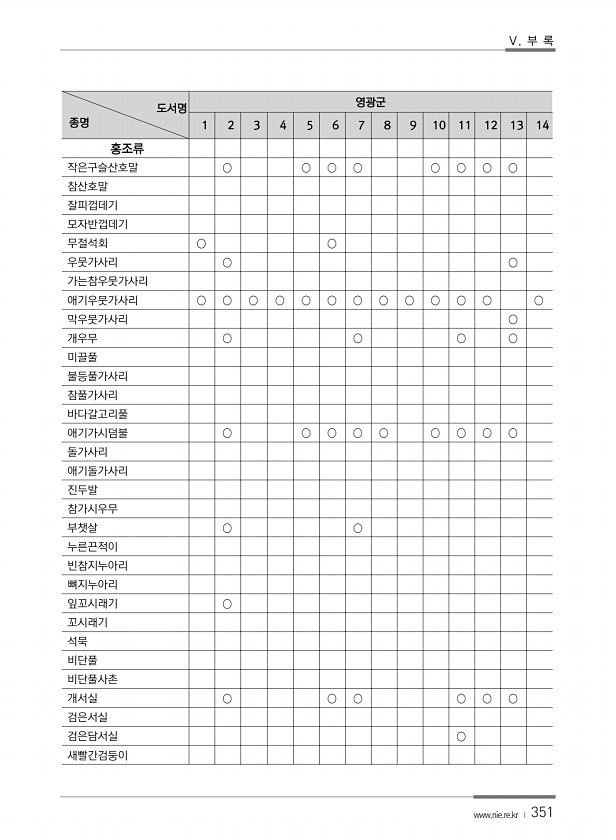 Ⅴ. 부 록 www.nie.re.kr ? 351 도서명 종명 영광군 1 2 3 4 5 6 7 8 9 10 11 12 13 14 홍조류 작은구슬산호말 ○ ○ ○ ○ ○ ○ ○ ○ 참산호말 잘피껍데기 모자반껍데기 무절석회 ○ ○ 우뭇가사리 ○ ○ 가는참우뭇가사리 애기우뭇가사리 ○ ○ ○ ○ ○ ○ ○ ○ ○ ○ ○ ○ ○ 막우뭇가사리 ○ 개우무 ○ ○ ○ ○ 미끌풀 불등풀가사리 참풀가사리 바다갈고리풀 애기가시덤불 ○ ○ ○ ○ ○ ○ ○ ○ ○ 돌가사리 애기돌가사리 진두발 참가시우무 부챗살 ○ ○ 누른끈적이 빈참지누아리 뼈지누아리 잎꼬시래기 ○ 꼬시래기 석묵 비단풀 비단풀사촌 개서실 ○ ○ ○ ○ ○ ○ 검은서실 검은담서실 ○새빨간검둥이