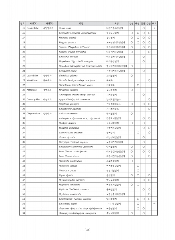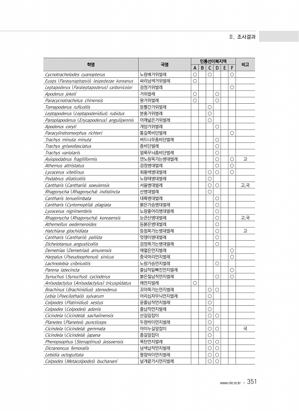 Ⅱ. 조사결과 www.nie.re.kr ? 351 학명 국명 민통선이북지역 비고 A B C D E F Cycnotrachelodes cyanopterus 노랑배거위벌레 ○ ○ ○ Euops Parasynaptopsis lespedezae koreanus 싸리남색거위벌레 ○ Leptapoderus Paraleptapoderus carbonicolor 검정거위벌레 ○ Apoderus jekeli 거위벌레 ○ ○ Paracycnotrachelus chinensis 왕거위벌레 ○ ○ Tomapoderus ruficollis 등빨간거위벌레 ○ Leptapoderus Leptapoderidius rubidus 분홍거위벌레 ○ Paroplapoderus Erycapoderus angulipennis 어깨넓은거위벌레 ○ ...