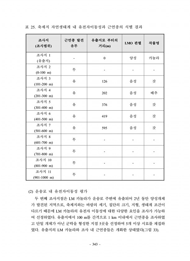 343 조사지 조사범위 근연종 발견 유무 유출지로 부터의 거리 m LMO 판별 작물명 조사지 1 유출지 0 양성 카놀라 조사지 2 0-100 m 무 조사지 3 101-200 m 유 126 음성 갓 조사지 4 201-300 m 유 202 음성 배추 조사지 5 301-400 m 유 376 음성 갓 조사지 6 401-500 m 유 419 음성 갓 조사지 7 501-600 m 유 595 음성 갓 조사지 8 601-700 m 무 조사지 9 701-800 m 무 조사지 10 801-900 m 무 조사지 11 901-1000 m 무 표 25. 축제지 자연생태계 내 유전자이동성과 근연종의 식별 결과 2 운송로 내 유전자이동성 평가 두 번째 조사지점은 LM 카놀라가 운송로 주변에 유출되어 2년 동안 양성개체 가 발견된 지역...
