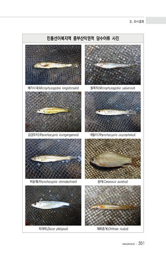 Ⅱ. 조사결과 www.nie.re.kr ? 351 민통선이북지역 중부산악권역 담수어류 사진 배가사리 Microphysogobio longidorsalis 돌마자 Microphysogobio yaluensis 금강모치 Rhynchocypris kumgangensis 버들치 Rhynchocypris oxycephalus 버들개 Rhynchocypris steindachneri 붕어 Carassius auratus 피라미 Zacco platypus 대륙종개 Orthrias nudus