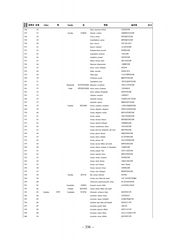336 전체 번호 분류군 번호 Order 목 Family 과 학명 일반명 비고 2746 156 Python timoriensis Peters 티모르비단뱀 2747 157 Scincidae 도마뱀과 Chalcides ocellatus 아셀레이티드도마뱀 2748 158 Corucia zebrata 멍키테일드도마뱀 2749 159 Cryptoblepharus egeriae 블루테일드도마뱀 2750 160 Dasya olivacea 자바그린스킨크 2751 161 Eumeces schneideri 슈나이더도마뱀 2752 162 Hemisphaeriodon gerrardii 핑크텅도마뱀 2753 163 Lampropholis guichenoti 가든도마뱀 2754 164 Lepidothyris fernandi 파이어도...