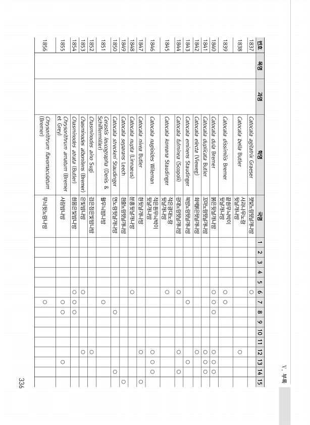 Ⅴ. 부록 336 번호 목명 과명 학명 국명 1 2 3 4 5 6 7 8 9 10 11 12 13 14 15 1837 Catocala agitatrix Graeser 잿빛노랑뒷날개나방 ○ 1838 Catocala bella Butler 사과나무노랑 뒷날개나방 ○ 1839 Catocala dissimilis Bremer 끝흰무늬박이 뒷날개나방 ○ ○ 1840 Catocala dula Bremer 붉은뒷날개나방 ○ ○ ○ ○ ○ ○ 1841 Catocala duplicata Butler 꼬마노랑뒷날개나방 ○ ○ ○ 1842 Catocala electa Vieweg 회색붉은뒷날개나방 ○ 1843 Catocala eminens Staudinger 북방노랑뒷날개나방 ○ ○ 1844 Catocala fulminea S...