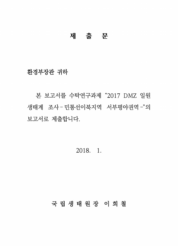 제 출 문 환경부장관 귀하 본 보고서를 수탁연구과제 “2017 DMZ 일원 생태계 조사 ? 민통선이북지역 서부평야권역 ?”의 보고서로 제출합니다. 2018. 1. 국 립 생 태 원 장 이 희철