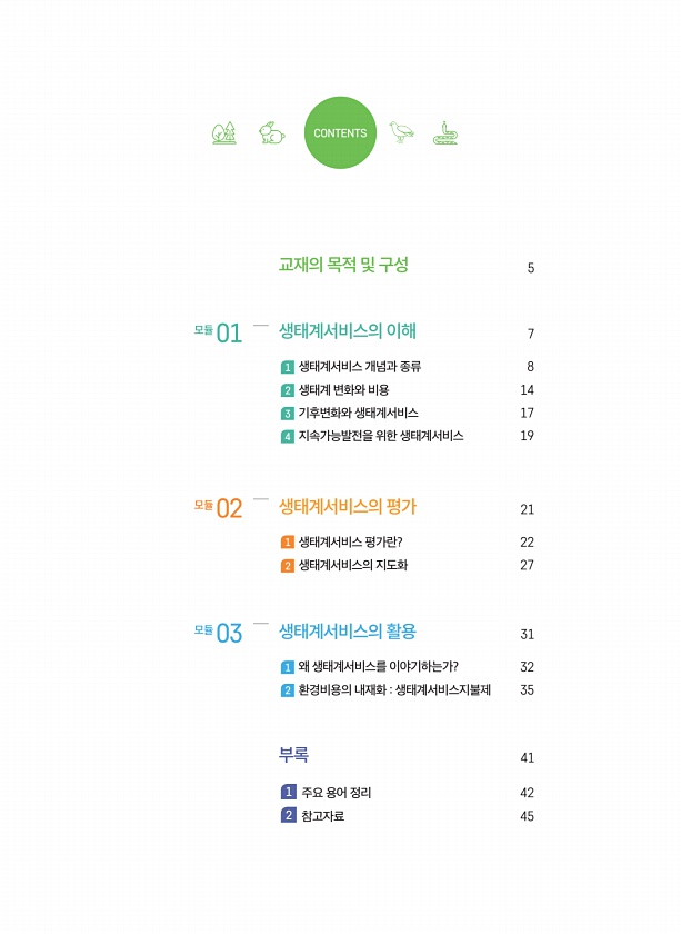 CONTENTS 모듈01 생태계서비스의 이해 7 1 생태계서비스 개념과 종류 8 2 생태계 변화와 비용 14 3 기후변화와 생태계서비스 17 4 지속가능발전을 위한 생태계서비스 19 모듈02 생태계서비스의 평가 21 1 생태계서비스 평가란? 22 2 생태계서비스의 지도화 27 모듈03 생태계서비스의 활용 31 1 왜 생태계서비스를 이야기하는가? 32 2 환경비용의 내재화 생태계서비스지불제 35 부록 41 1 주요 용어 정리 42 2 참고자료 45 교재의 목적 및 구성5