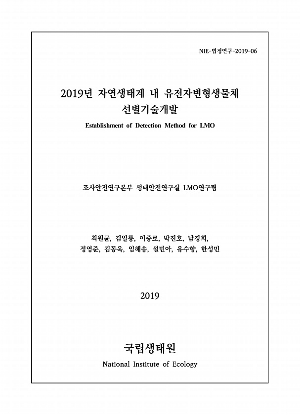NIE-법정연구-2019-06 2019년 자연생태계 내 유전자변형생물체 선별기술개발 Establishment of Detection Method for LMO 조사안전연구본부 생태안전연구실 LMO연구팀 최원균, 김일룡, 이중로, 박진호, 남경희, 정영준, 김동욱, 임혜송, 설민아, 유수향, 한성민 2019 국립생태원 National Institute ofEcology
