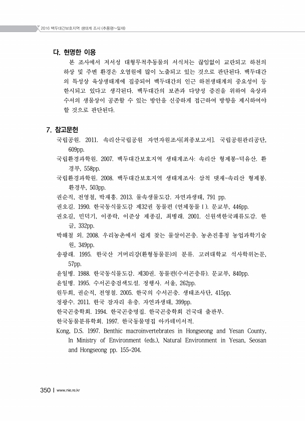 2016 백두대간보호지역 생태계 조사 추풍령밀재 350Ⅰwww.nie.re.kr 다. 현명한 이용 본 조사에서 저서성 대형무척추동물의 서식처는 끊임없이 교란되고 하천의 하상 및 주변 환경은 오염원에 많이 노출되고 있는 것으로 판단된다. 백두대간 의 특성상 육상생태계에 집중되어 백두대간의 인근 하천생태계의 중요성이 등 한시되고 있다고 생각된다. 백두대간의 보존과 다양성 증진을 위하여 육상과 수서의 생물상이 공존할 수 있는 방안을 신중하게 접근하여 방향을 제시하여야 할 것으로 판단된다. 7. 참고문헌 국립공원. 2011. 속리산국립공원 자연자원조사[최종보고서]. 국립공원관리공단, 609pp. 국립환경과학원. 2007. 백두대간보호지역 생태계조사속리산 형제봉덕유산. 환 경부, 558pp. 국립환경과학원. 2008...