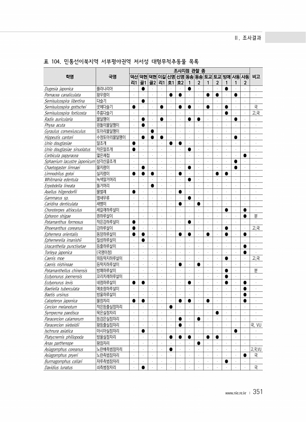 Ⅱ. 조사결과 www.nie.re.kr ? 351 학명 국명 조사지점 관찰 종 덕산 비고 리1 덕현 골1 덕현 골2 이길 리1 신명 호1 신명 호2 동송 1 동송 2 토교 1 토교 2 빙애 1 사동 1 사동 2 Dugesia japonica 플라나리아 ● ● ● Pomacea canaliculata 왕우렁이 ● ● ● ● ● Semisulcospira libertina 다슬기 ● Semisulcospira gottschei 곳체다슬기 ● ● ● ● ● ● 국 Semisulcospira forticosta 주름다슬기 ● 고,국...